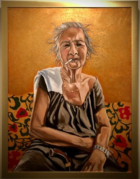 The portrait was completed just a few months before her passing. At 94, after suffering a stroke, it became clear that our family could no longer provide the consistent, intensive care she needed here in Canada. With the long, cold, and slippery Winnipeg winters and her growing fragility, we made the difficult decision for her to return to the Philippines, where she could live her final days surrounded by familiar sounds, smells, and warmth. It was in this time of anticipatory grief that I was inspired to paint her—not as a farewell, but as a celebration of a life well-lived. A cousin had captured this image of her, an ordinary moment that spoke volumes, reflecting her strength, stubbornness, humor, and unspoken love. After seeing the image in a group chat between my cousins and I, I knew I had to commit it to canvas.