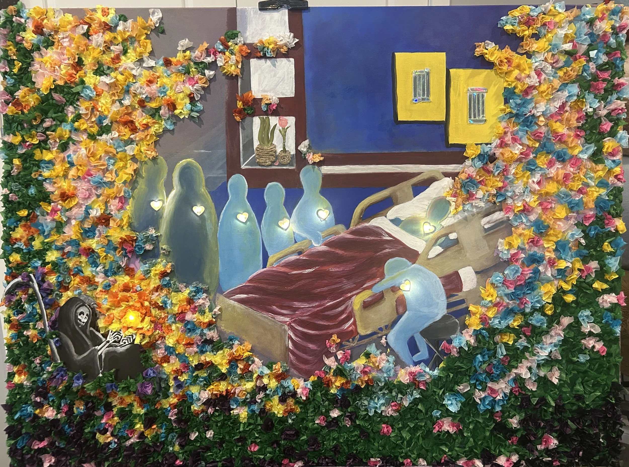 My piece, titled “Chapter One: Until the Last Flower”, is a mixed-media canvas that blends acrylic paint, hundreds of individually folded tissue paper, cardboard, rope, broken CDs, and LED string lights to explore the complex and sacred experience of dying. Created from my reflection of a lived perspective as a former student who completed their internship in both hospice and acute care settings. This piece was shaped by my struggles with chronic illness, clinical training in end-of-life spaces, and wrestling with lost time. This work stands at the intersection of grief, beauty, and bearing witness.