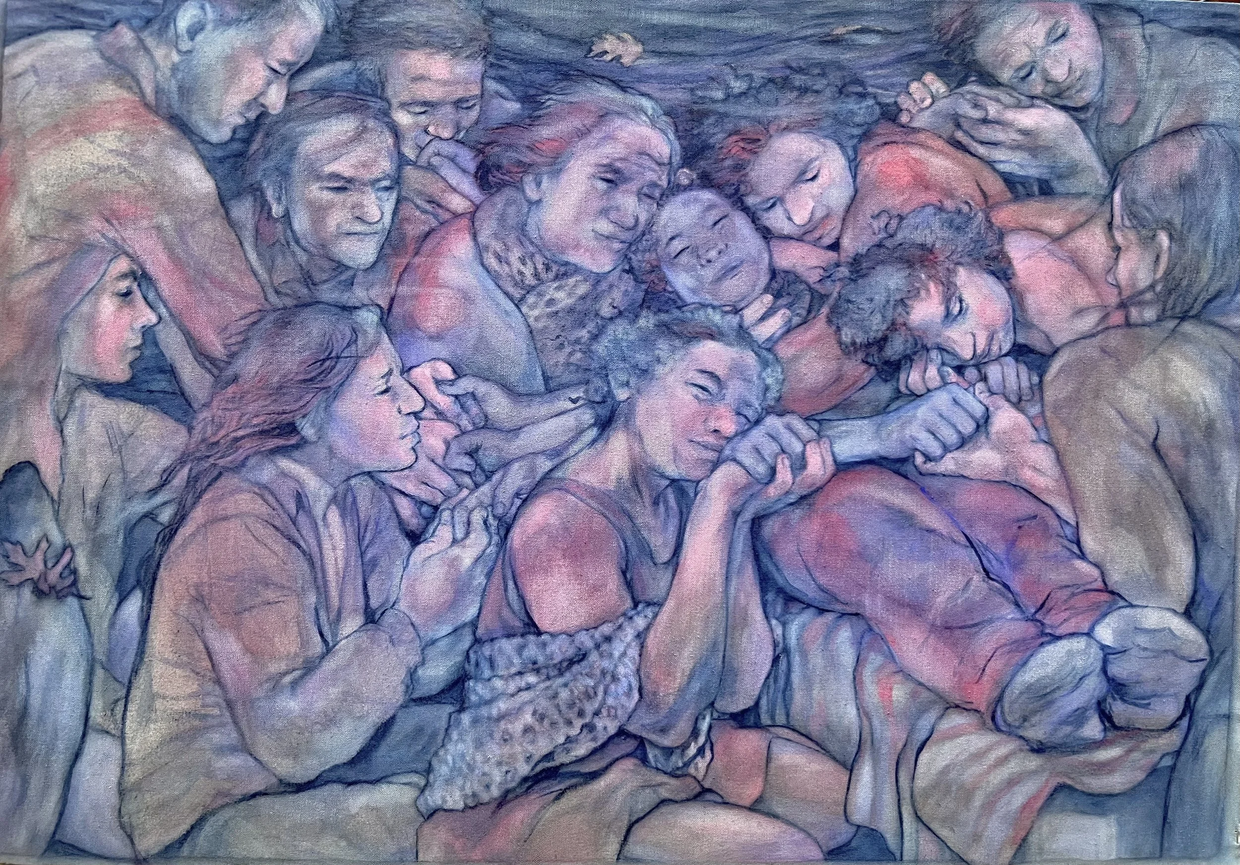 The painting presented here is a watercolour on raw canvas. 27 inches by 38 inches. The technic is chaotic with mostly over-rubbed brushes and a lot of water. The only intent is to convey the emotions and the soul impression as lived and as the mind imprinted it.The subject is strongly inspired by a personal event where, in an indefinite moment, the imagery of the situation became so visually ultimately beautiful that it's impression on the brain felt deafening and art seemingly became the only solve. In this depiction we see a central subject which is my dear friend Melissa, as she lays passed her last breath on the date and time of her MAID, in the reality of a progressing degenerative disease. The group attending was about thirty of us by her request and all were with her until the very end following her offer. Although only her mother was cradling Melissa and I was close enough to hold her hand, it felt like all of us were at cheek range of her. Just as she had gracefully given personal time to each one of us moments before, everyone felt connected to her in the very moment of her passing and her mind was seemingly with every one of us. Her thoughts were resolute and her body tired. Her last words were "bye tout l'monde!"(bye everybody!).The three days prior were made of music, food and shared love. Arrangements were made by her closest friends under her instructions. Her shoes were only removed after her death for she wanted her shoes on until the end. When the November mourning winds cut the electricity power and left us with Melissa's body in the dark with candles as the transporters made their long way up to the chalet, we knew everything went as perfect as it could be in the most unjust of worlds. She was wrapped in her favourite blanket, face uncovered, with the body bag left unzipped until the transporters were out of sight, like the family was hoping for.My intentions with this painting are to describe the vision of love and quietude in a moment of pain and clinging desires. To bring together peace and sorrow. By the colours, evoke feelings of chill and warmth.